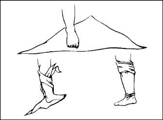 三角巾包扎小腿和脚将三角巾铺平,顶角在前,将伤脚放于三角巾中央适当位置,反折顶角于脚背,再将两底角提起包裹顶角,绕踝关节部位的肢体后固定打结(如图3-25所示)。