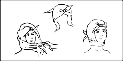 风帽式包扎法适用于颅顶部、面部、下颌和伤肢残端的包扎。将三角巾顶角和底边中央各打一结,形似风帽,然后将顶角结放于前额正中,底边结置于枕外隆突下方,两手垂直向下拉紧两底角,分别在下颌处反折交叉后绕至枕后结上打结固定(如图3-24所示)。