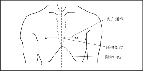 进行心外按压能使伤病员重建循环。进行时,抢救者可采用踏脚凳或跪式等不同体位,用靠近伤病员身体左侧的手的食指和中指置于伤病员胸骨下切肌上方,用另一只手的掌根部紧靠前一只手食指,放于胸骨下三分之一处(如图3-21所示),掌根部长轴与胸骨长轴重合,然后将前一只手置于另一只手手背,两手手指交叉抬起,使其不接触胸壁。按压时双肘伸直,垂直向下用力按压,下压深度4~5厘米,按压频率每分钟100次,按压时间与放松时间各占50%,放松时掌根不能离开胸壁,以免按压点移位。