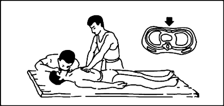 双人同时进行人工呼吸及心外按压时,一人先做口对口人工呼吸2次,另一人做心外按压30次,以后人工呼吸数与心外按压数按2次、30次反复进行(如图3-22所示)。