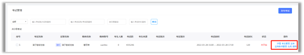 详情、考生管理、监考、监考教师管理、批阅、删除