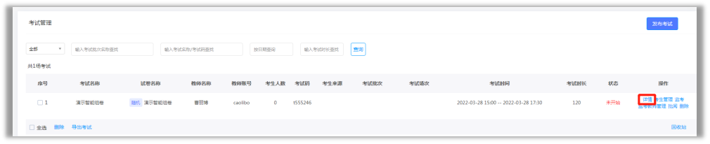 ①点击对应考试的【详情】,进入考试发布设置界面,可以查看和修改考试设置。