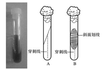 3)斜面接种法 因有两种不同用途的斜面培养基,所以接种方法有所不同。一种是用于菌株的移种,以获取纯种进行鉴定和保存菌种,也可用于菌种的传代,常用(血)营养琼脂斜面培养基,方法是用接种环挑取单个菌落,自斜面底端向上划一条直线,然后直接返回底部向上做Z字形(似蛇形)连续划线接种(图1-8);另一种是用于生化鉴定的斜面培养基,如克氏双糖铁、三糖铁等斜面培养基,方法是用接种针挑取少许细菌,先以穿刺法刺入培养基,再直接返到斜面底端向上做Z字形(似蛇形)连续划线接种(图1-9)。