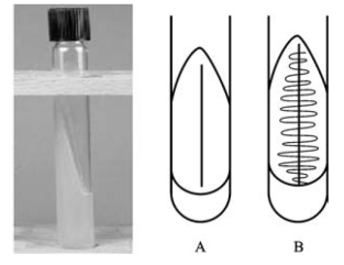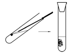 4)液体接种法 该法主要用于肉汤、蛋白胨水、糖发酵管等液体培养基的接种。方法是接种时将试管倾斜30°~45°角,用接种环挑取标本或培养物在试管内壁与倾斜下液面交接处反复研磨,使细菌混合液扩散于培养基中,试管直立培养时接种处位于培养基中部,细菌可辐射状扩散到上、中、下三层培养基中生长繁殖(图1-10)。