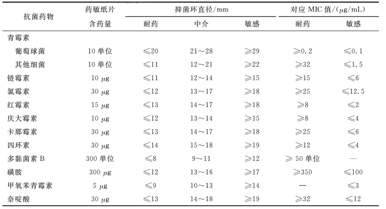 表3-1 常用药敏实验药敏纸片判断标准与其相应的MIC近似值
