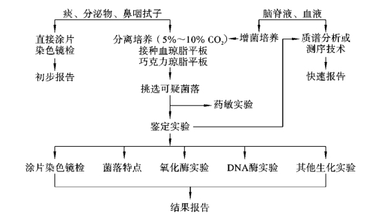 (2)培养基:巧克力琼脂平板,血琼脂平板,葡萄糖发酵管,麦芽糖发酵管,蔗糖发酵管,硝酸盐培养基,DNA酶琼脂平板等。