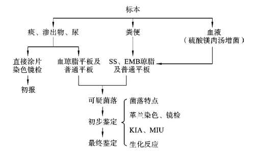 (3)培养基 血琼脂平板、EMB琼脂平板、KIA及MIU培养基、蛋白胨水、葡萄糖蛋白胨水、枸橼酸盐、尿素培养基等。