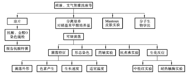 1.标本采集 根据感染部位不同采取不同标本。对于肺部感染患者采取咳痰,最好是患者清晨第一口痰;对于淋巴结感染患者,通过细针针吸活检获取标本组织;对于脑脊液标本采集,以无菌要求做腰椎穿刺抽取脑脊液。