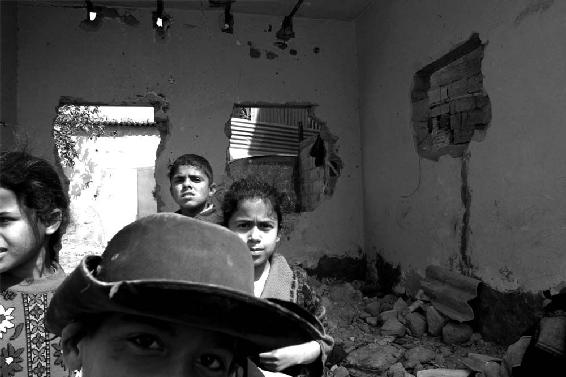 发生枪战的巷子窄得仅容一人通过,两边人家的墙壁打出好几个胳膊长的窟窿。当地人说是以色列士兵炸开墙壁,躲在背后伏击巴勒斯坦枪手。一个窟窿望进去是厨房,满地碎片,母亲和一个孩子呆呆站着,满地碎片。向外看,孩子们在废墟间跳跃,背后是千疮百孔的家。