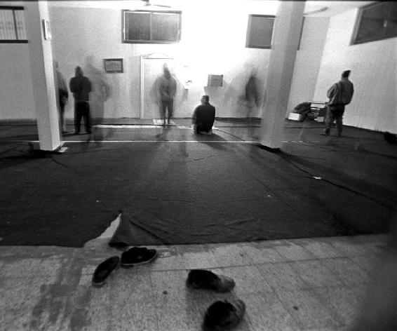 进入走廊。恶臭扑鼻。旁边有男女两个厕所,都没有门。再往前走,是“祈祷区”。参加晨礼的巴勒斯坦工人跪倒一片。