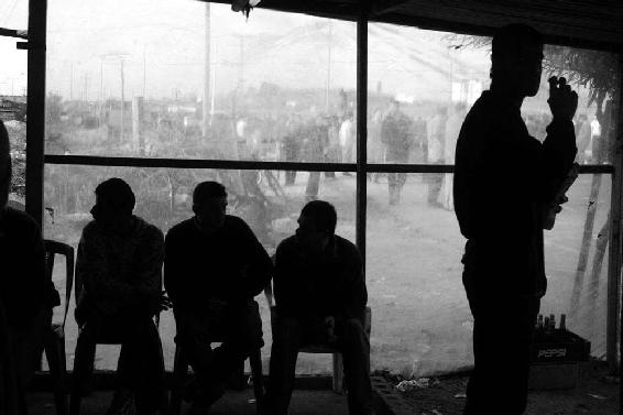过了店铺,巴方检查处已是人山人海。绿军装的巴勒斯坦安全部队士兵站在一张椅子上喊名字,工人们依次上前领取打工证。一盏灯泡昏黄的暗影里,裹着长袍头巾的巴勒斯坦妇女坐在地上。见我拍照,其中一个过来“理论”:“你为什么不早点来拍?我昨天一点钟来,九点才过关!”她在出埃雷兹不远的以色列小镇做罐头水果。