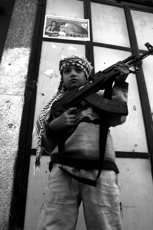两天后,再次去苏希家。不过两天,父亲就比那天在墓地瘦了好几圈。妈妈木然地容我和另一个摄影师横拍竖拍。有人拿烈士像过来做背景,妈妈一下子捂脸哭起来。我们于心不忍,走开了。一个穿军装的男子把苏希的弟弟拉来:“你们一定要给这个孩子拍照,长大后,他一定能灭了以色列总理沙龙!”于是他让苏希的弟弟扎起黑白头巾,一把冲锋枪塞到他手里。