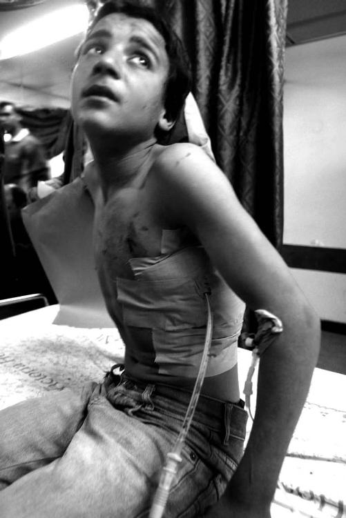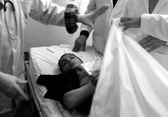 15岁的穆罕默德·阿卜杜拉坐在病床边,肚子和胸口插着管子。他两眼朝天,医生在做记录。是那“小孩”吗?“不,”医生一指,“那里,那里还有一个……”