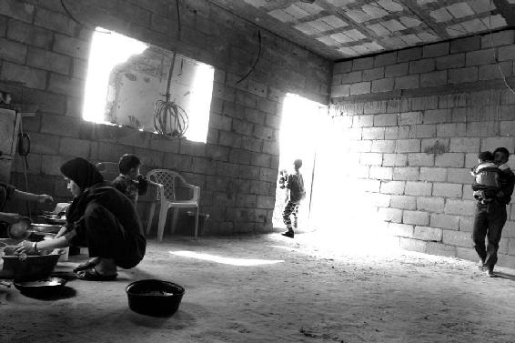 穿过羊肠小道,耳边苍蝇嗡嗡响。马哈茂德一指,到了。灰色的水泥房子,没有门,没有窗。确切地说,门框和窗框都在,只是空的。窗框上用绳子吊了块缺角的石板,石板是为了挡住冬季的雨水,四周露着光。马哈茂德说,因为交不起账单,家里没有煤气,也没有电,只是从邻居那里接根电线过来,亮一盏日光灯,供上学的孩子写作业。