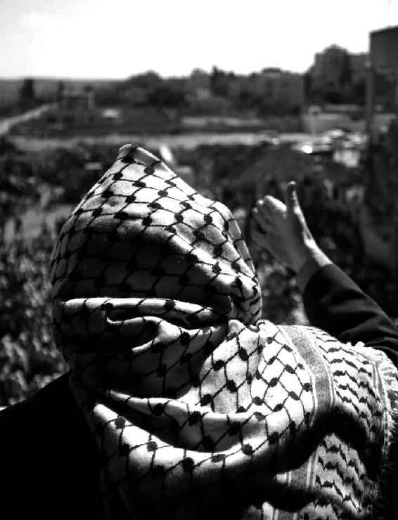 从大楼第三层望下去,一方黑白格相间的头巾出现在被沙包、汽车轮胎堵得严严实实的官邸门口。一个“V”字胜利手势举过头巾——阿拉法特出现了。