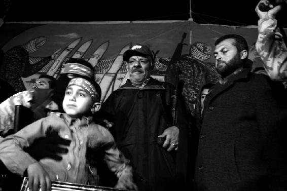 一名死者的父亲站在台中央,手里被人塞了把枪。他悲伤,又绝决,眼里噙着泪。见记者拍照,有人试图拿掉他手里的枪,老人不让,抓得更紧。当蒙面的哈马斯代表们致哀完毕,离开舞台时,老人一挺腰杆,敬了个军礼。