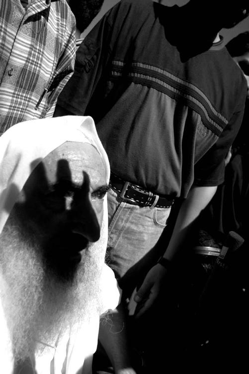 /亚辛第一次遭到以色列导弹袭击逃生后,接见支持者,他的脸部被一块阴影遮挡