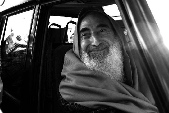 窄门一开,一双踏在轮椅上的大脚先伸出来。亚辛现身立即被十多名记者以各种姿势团团围住。所谓“各种姿势”,是记者间达成的默契,最靠近采访对象者蹲下,中间的半蹲,给身后其他记者让出拍摄空间。尽管如此,镜头与镜头之间仍然难免摩擦。起先我站在亚辛左手外围,屡屡遭到其他记者遮挡,于是绕到右边,试图打进“中心圈子”。