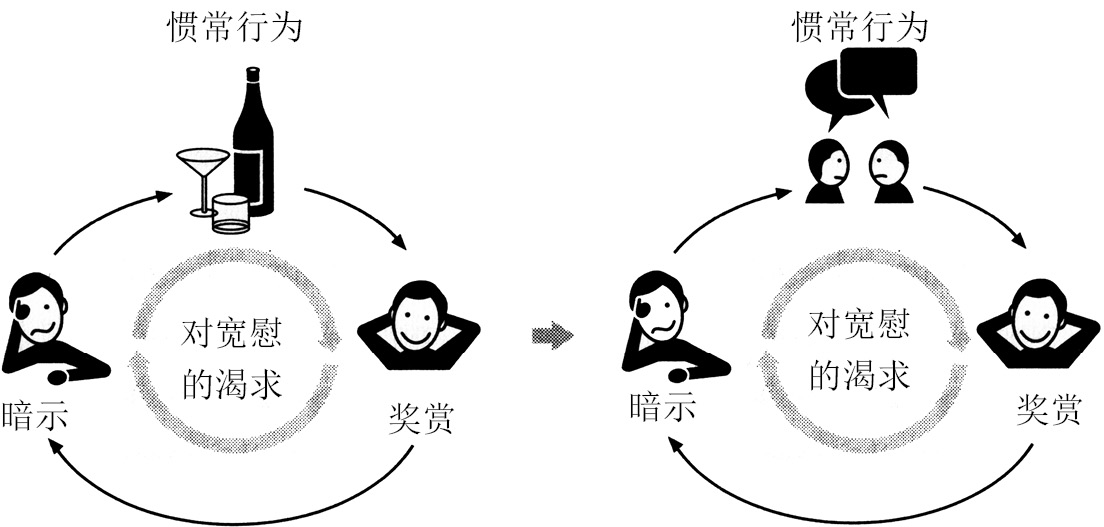 “匿名戒酒互助社迫使你去建立一种新的惯常行为,让你每天晚上有事可干,而不是酗酒。”托尼甘说,“你可以在聚会时放松自己,谈论你的焦虑。事件的诱因和回报还是一样,只是行为改变了。”
