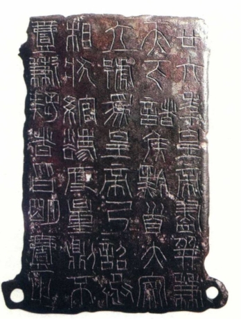 纵观历史,正因为文字的种种用途才留下了异彩纷呈的书法艺术,口口声声宣扬独立的一些当代书法不正是在千百年来的各式各样的日用器什中讨取生计吗?除了学习字形与笔法,我们把古代的文字布局形式乃至风格气息统统借鉴遍了,如颇具装饰感的钟鼎口沿环形铸刻文字的形式(图六十二),诏版草率刊刻意连笔断的形式(图六十三),简册的形式等等,但是,对于这些学习对象,我们仍然不完全承认它们就是古代的书法作品,嫌弃实用的器妨碍了心目中虚无缥缈的所谓道,并以此显示我们历史观的所谓客观性。蠹生于木还食其木,数典忘祖,非此而何!这样的历史态度与其说客观,不如说麻木更为近真。在“你妈就是你妈”“你没有撞她为啥要扶她”等显见的事实尚需证明的如此变态的大众意识下,古代的一切字迹的书法性都变得可疑。这不单是书法史观的问题,简直就是历史观的问题,是居心所在的问题,是信仰的缺失。