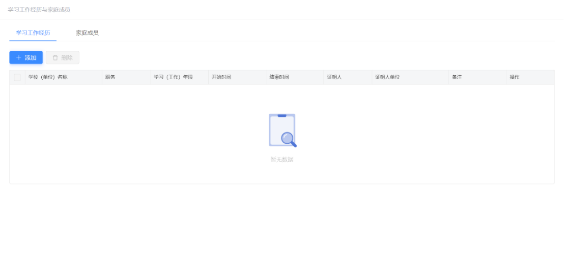 操作说明:进入应用门户中,点击右上角进入空间,进入个人空间,点击【个人管理】→【学习工作经历与家庭成员】,进入如图2-3所示界面。点击【添加】,可以添加学生的学习工作经历或者家庭成员。