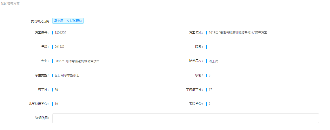 操作说明:进入应用门户中,点击右上角进入空间,进入个人空间,点击【培养管理】→【我的培养方案】,进入如图3-2所示界面,可以查看自己的培养方案。