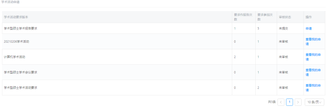 操作说明:进入应用门户中,点击右上角进入空间,进入个人空间,点击【培养管理】→【学术活动申请】,进入如图3-4-2-1所示界面,点击【申请】,可以进行学术活动申请。