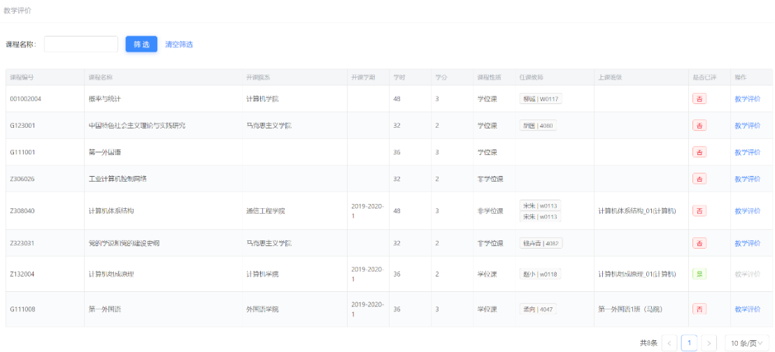 操作说明:进入应用门户中,点击右上角进入空间,进入个人空间,点击【培养管理】→【教学评价】,进入如图3-6所示界面,可以输入课程名称,点击【筛选】,查看所有课程列表。点击【教学评价】,可以进行评价,如图3-6。如已经完成评价,【是否已评】显示【是】,教学评价已完成。