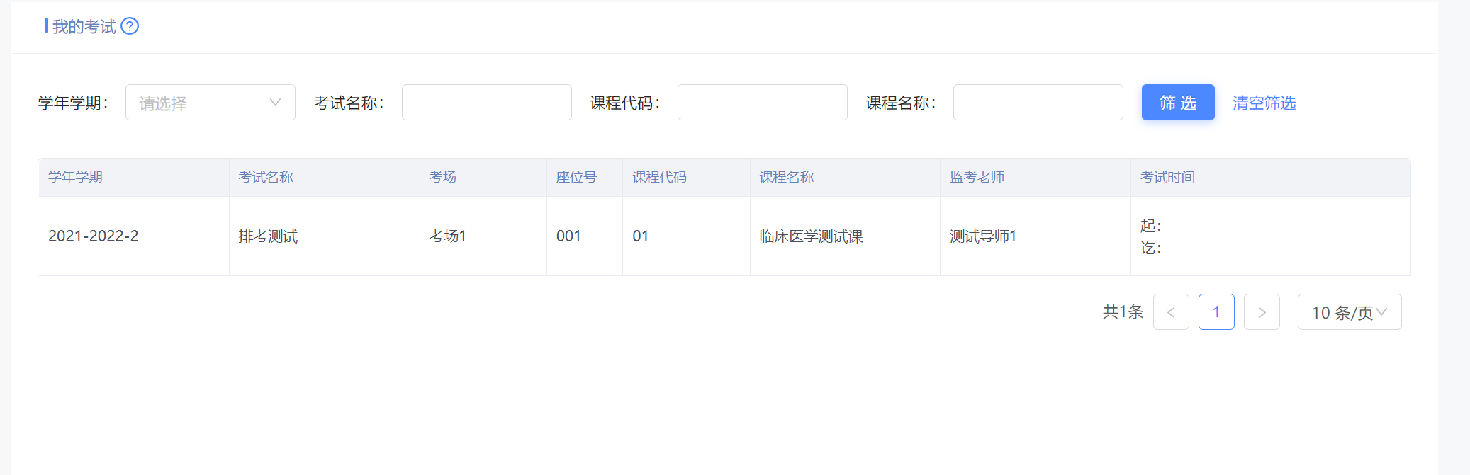 操作说明:进入应用门户中,点击右上角进入空间,进入个人空间,点击【培养管理】→【我的考试】,进入如图3-5所示界面,可以输入学年学期、考试名称、课程编号或课程名称,点击【筛选】,查看考试记录,可查看考场、座位号、监考老师、考试时间信息。