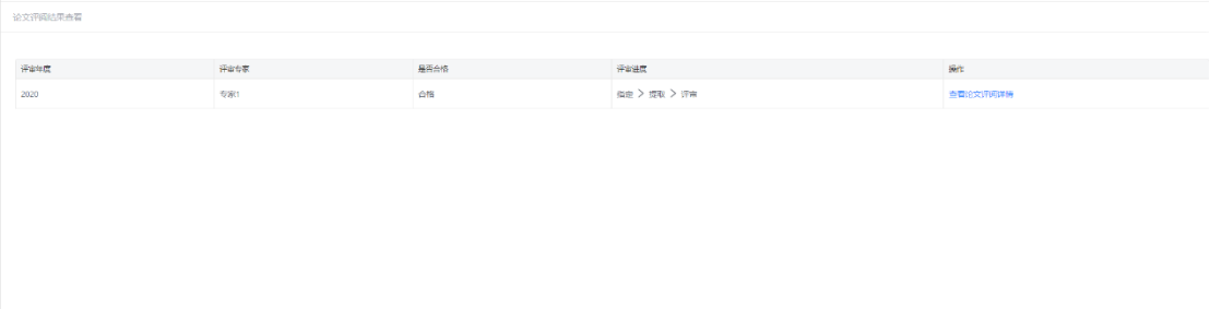 操作说明:进入应用门户中,点击右上角进入空间,进入个人空间,点击【论文管理】→【论文评阅结果查看】,进入图4-4页面,可查看评审年度、评审专家、是否合格、评审进度、点击操作栏【查看论文评阅结果】,可以查看评阅结果。
