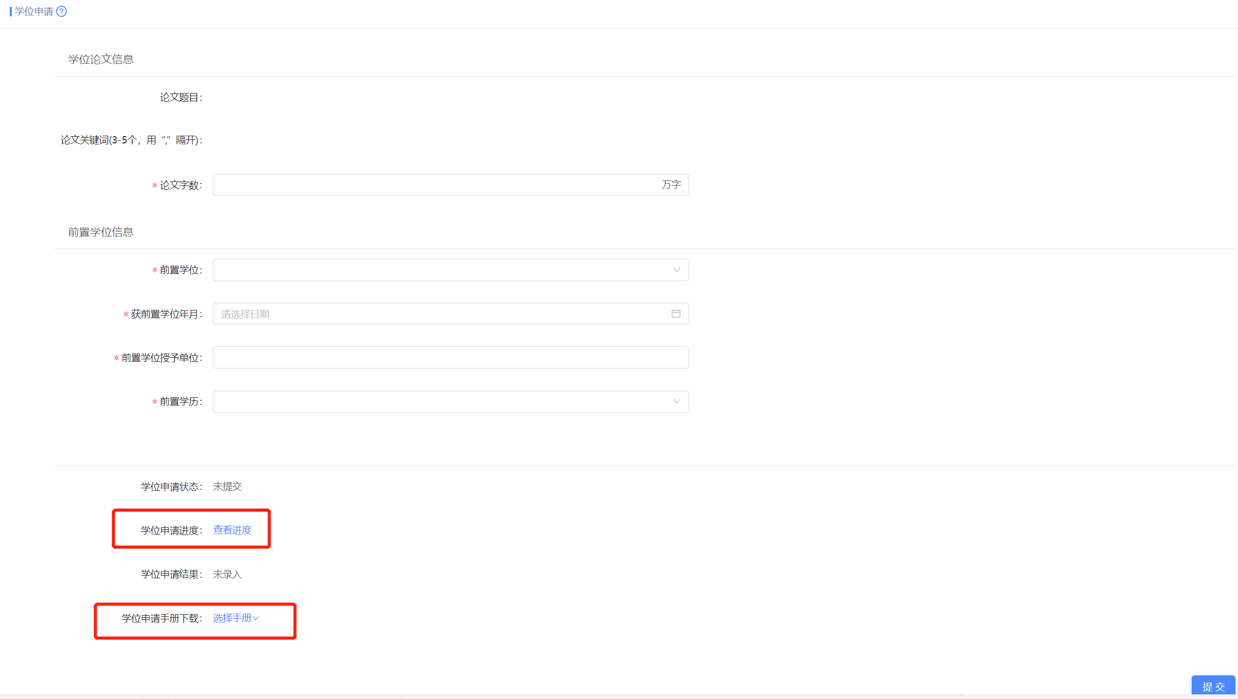 学生需要填写学位论文字数、前置学位信息,点击“提交申请”按钮后不可再编辑。