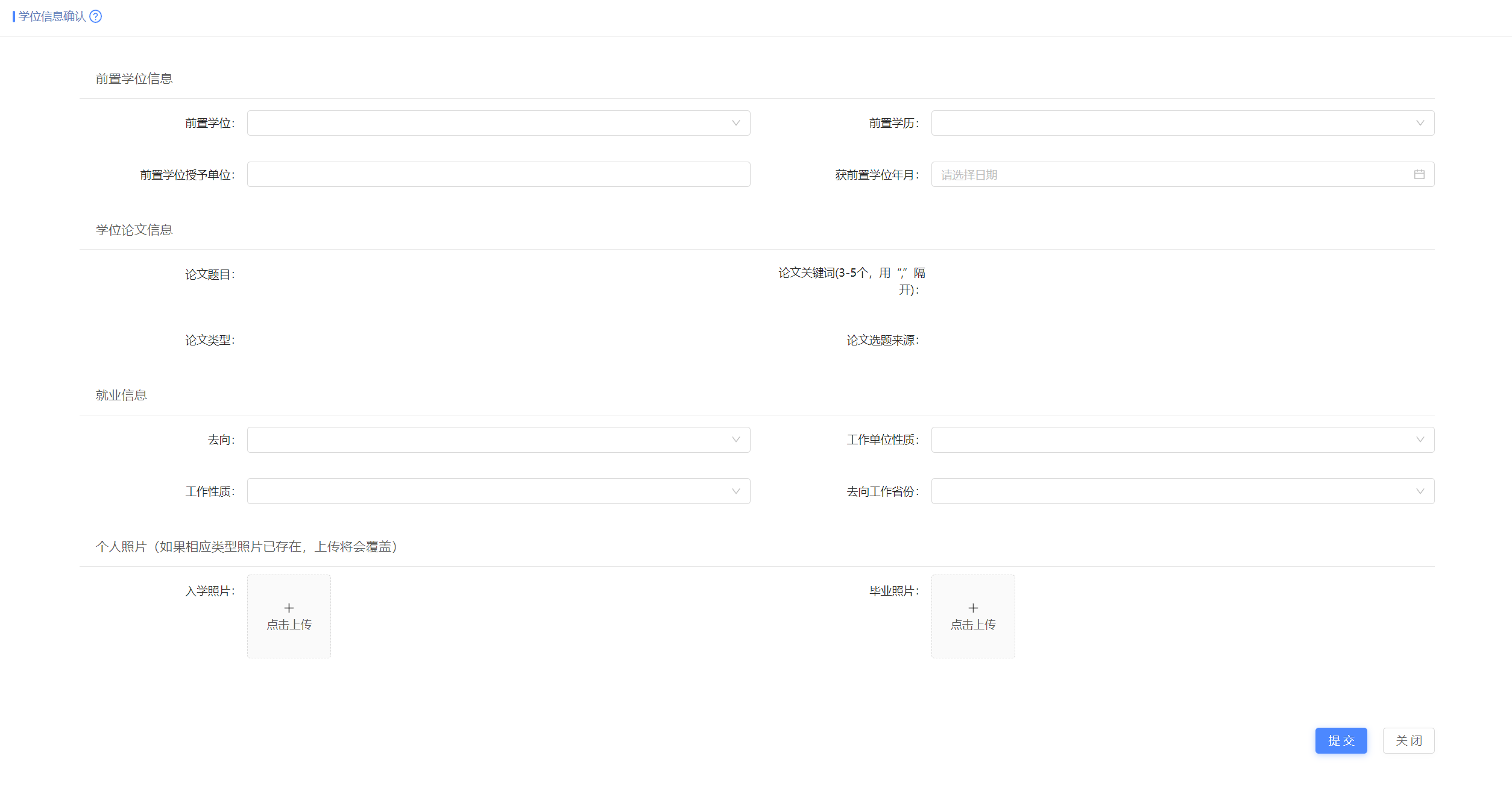 功能说明:学生进入学位信息确认页面,核实自己的个人基本信息、学位授予信息、学位论文信息、前置学位信息、就为去向以及个人照片是否正确。确认学位信息后,不可再修改,如要修改需联系学校管理员。
