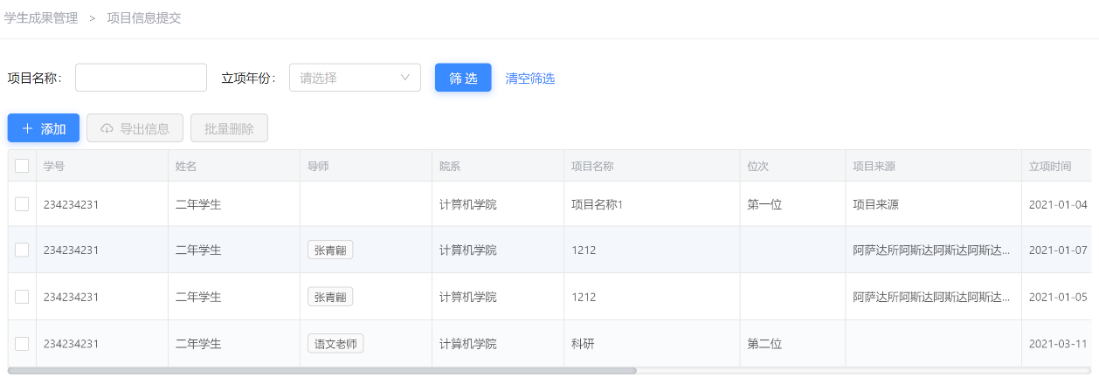 操作说明:进入应用门户中,点击右上角进入空间,进入个人空间,点击【研工管理】→【项目信息提交】,进入图6-1-2页面,点击【添加】,可以添加新的项目;可以按照项目名称和立项年份对项目信息进行筛选。