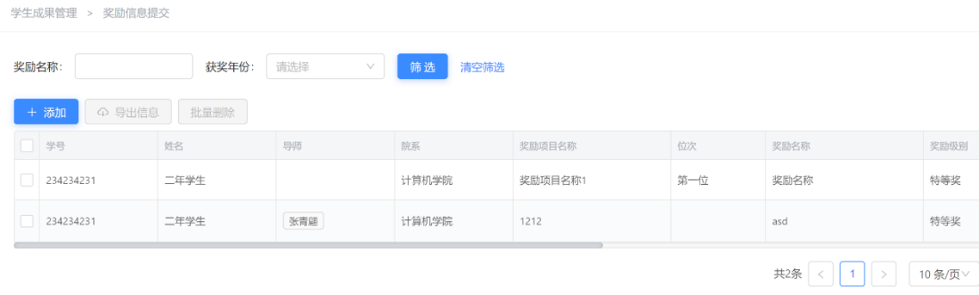 功能说明:学生可以提交奖励成果,每个成果都可以上传附件,等待导师、管理端审核。