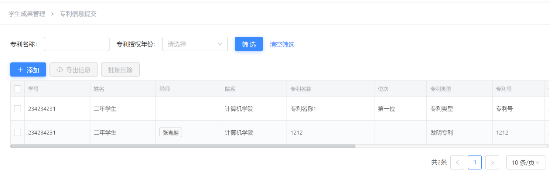 功能说明:学生可以提交专利成果,每个成果都可以上传附件,等待导师、管理端审核。
