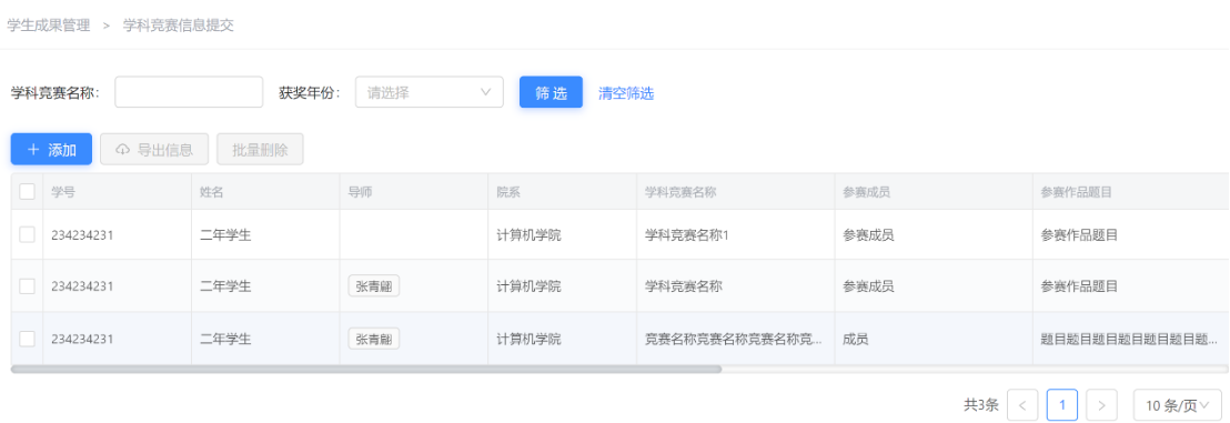 操作说明:进入应用门户中,点击右上角进入空间,进入个人空间,点击【研工管理】→【专著信息提交】,进入图6-1-6页面,点击【添加】,可以添加新的学科竞赛信息;可以按照学科竞赛名称和获奖年份对学科竞赛进行筛选。