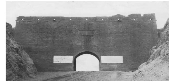 清代的潼关“第一关”是一座砖筑的高大关楼,建在“五里暗门”东端进沟后约数十米处的沟道中,直接堵住了进沟的通道。关门日出则启,日入则闭,是守卫潼关的第一道关口。暗门向东走尽,即秦、豫交界处。入关而下经第一塞出远望沟口,始见形若虎踞的潼关东门楼。“第一关”的关楼,高约10余米、厚约10余米,楼上并没有楼,只是个大平台。全部用大城砖筑砌,糯米汁灌浆。关楼为什么不建在沟口呢?因为若建在沟口,关前就是开阔地。而建在进沟后的数十米处,关楼前谷道狭窄,不便于敌军疏散,更便于守方杀敌。