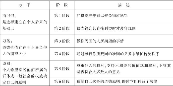 如表4.3所示,第一个水平称为前习俗(Preconventional)水平。在这个水平上,个人仅当物质惩罚、报酬或互相帮助等个人后果卷入时,才对正确或错误的概念作出反应。当演进到习俗(Conventional)水平时,表明道德价值存在于维护传统秩序和他人的期望之中。而在原则(Principled)水平上,个人作出明确的努力,摆脱他们所属的团体或一般社会的权威,确定自己的道德原则。通过对道德发展阶段的研究,人们得出4个结论: