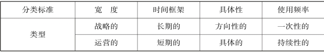 划分计划类型的方法有:根据计划的宽度、时间框架、具体性以及计划的使用频率。这些分类方法所划分出的计划类型不是相互独立的。比如,短期和长期类型之间就存在紧密的关系,类似的还有战略和运营类型之间的关系。表6.2列出了按不同方法分类的计划类型。