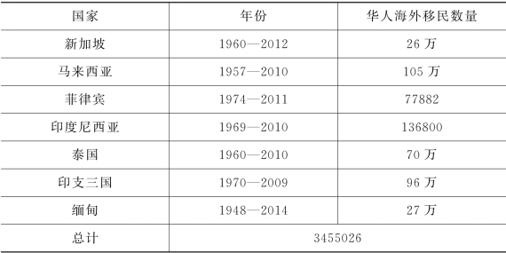 多种因素导致东南亚地区华人海外移民估算的困难。首先,东南亚华侨华人数量规模的不确定。战后绝大部分东南亚华人相继加入当地国籍,其身份认同呈多元化状态。很多华人或自愿或被迫同化于当地社会,隐瞒华人特征,导致其“华人”身份认定的不确定性,在社会人口统计中多被归入土著民族。其次,华侨华人问题一直被东南亚各国政府视为敏感问题,其真实存在状况的信息通常被回避或扭曲。即使在新加坡政府发布的族群结构统计数据中,也未公布非永驻新加坡的外国人来源地的统计数据。除新加坡和马来西亚外,其他国家几乎没有任何关于族群结构的可靠统计资料。再次,东南亚各国的出入境统计数据大多不全,尤其是没有关于出入境日期类型的明确记录。最后,在缅甸、柬埔寨、老挝乃至菲律宾和泰国,很多中国新移民可通过各种方式改变居留身份而不进入官方的归化统计记录。以上种种情况导致对东南亚华侨华人数量把握的困难,在此基础上更难以推估华人海外移民的规模。