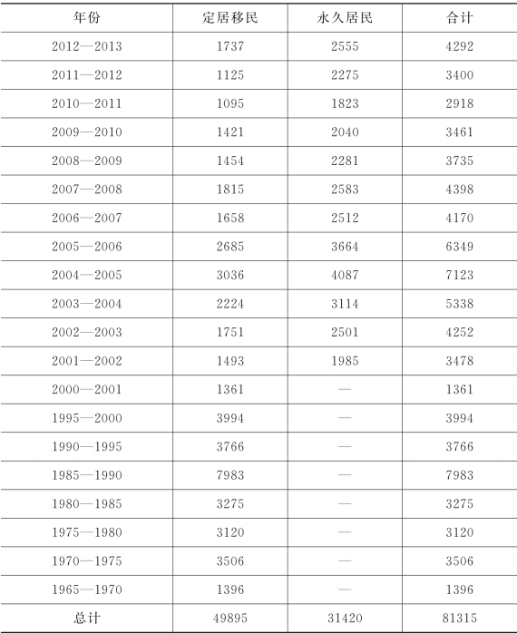 汇总澳大利亚移民局移民数据,1965—2012年,新加坡定居移民和永久居民的数量为81315人(表3-3)。