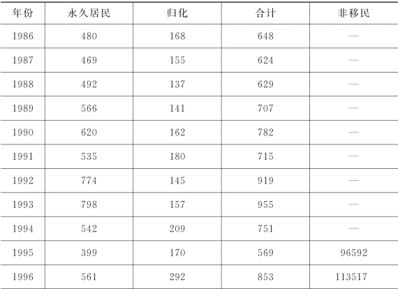 资料来源:根据澳大利亚移民局移民报告汇总而得(Immigration Update,1996—2012,Statistical Publications,Department of Immigration and Border Protection,Australian Government)。备注:定居移民(settler arrival)通常是指持有长期或短期签证抵澳,并且想定居澳洲的人。该移民计划包括家庭流动、技术流动和特殊技能移民。永久居民(permanent resident)指持有永久居民签证,可以永久居住于澳大利亚的外国公民。