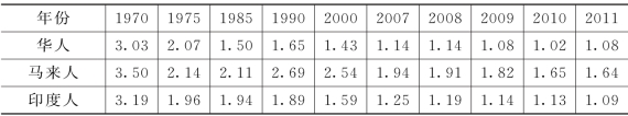 表3-4 1970—2011年新加坡三大族群人口生育率 单位:%