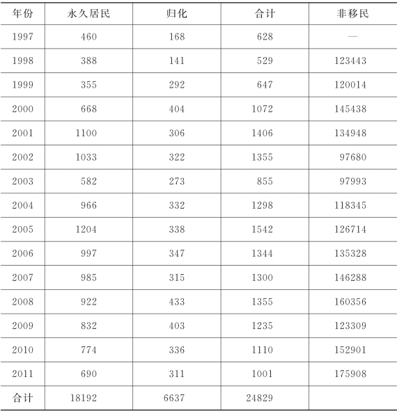 资料来源:根据美国国土安全部1986—2011年移民年鉴汇总而得(Yearbook of Immigration Statistics,1986—2011,Office of Immigration Statistics,Homeland Security,U.S.)。备注:非移民包括旅游和商务往来者、留学生及访问学者、短期劳工及家属、外交工作人员及代表等短期居住的移民,并非以移民为目的。在统计时,美国将新加坡公民和永久居民以非移民身份入境的合并统计在非移民分类里。