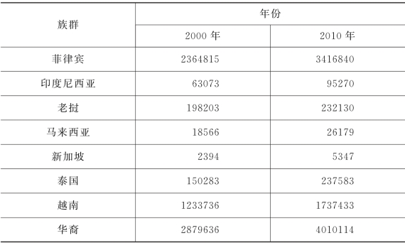 根据2010年美国人口普查,截至2010年,华人(华裔)总量增至4010114人。[82]东南亚地区各国移民及其后裔数量分别为:菲律宾移民及其后裔数量为3416840人,印尼移民及其后裔数量为95270人,老挝移民及其后裔数量为232130人,柬埔寨移民及其后裔数量为276667人,马来西亚移民及其后裔数量为26179人,新加坡移民及其后裔数量为5347人,泰国移民及其后裔数量为237583人,越南移民及其后裔数量为1737433人。[83]具体见表3-16。
