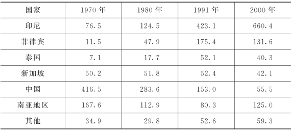 马来西亚的移民按出生地来分,主要来自印尼、菲律宾、泰国、新加坡、中国、南亚地区和其他东南亚国家。根据1970—2000年马来西亚人口普查结果,国外出生的马来西亚人口数量分别为:1970年76.4万,1980年67.3万,1991年98.8万,2000年156.3万。具体见表5-2。