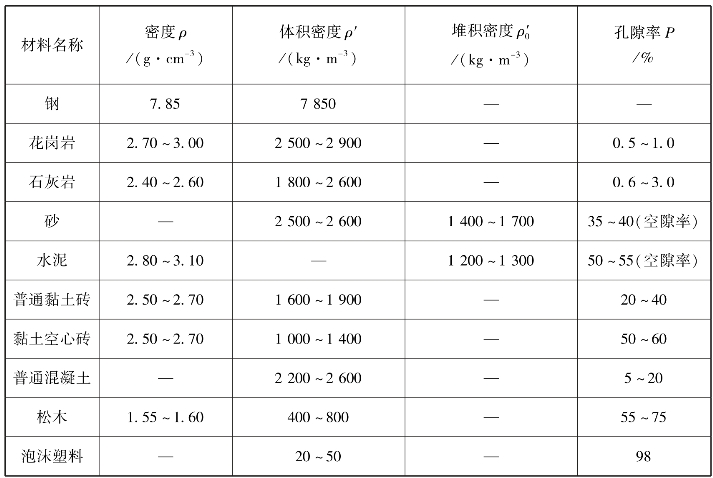 常用材料的密度、表观密度、堆积密度及孔隙率见表1.1。