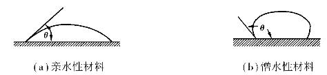 材料的亲水性与憎水性可用润湿角θ来说明,当材料与水接触时,在材料、水、空气三相的交点处,作沿水滴表面的切线,该切线与固体、液体接触面的夹角称为润湿角θ。θ越小,表明材料易被水润湿。实验证明,当润湿角θ≤90°,这种材料称为亲水性材料,如图1.2(a)所示;当润湿角θ>90°时,这种材料称为憎水性材料,如图1.2(b)所示。
