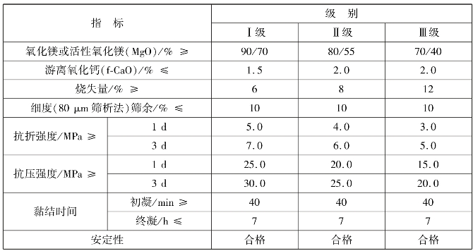 煅烧适当的轻烧氧化镁的密度为3.1~3.4 g/cm3,堆密度为800~900 kg/m3。按《镁质胶凝材料用原料》(JC/T 449—2008)规定,轻烧氧化镁按物理化学性能分为Ⅰ级、Ⅱ级、Ⅲ级,其物理化学性能必须满足表3.6的规定,氯化镁的化学成分应符合表3.7的规定。