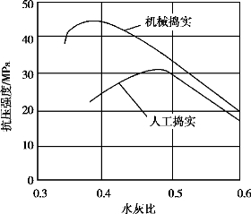 混凝土采用机械搅拌,不但效率高,而且搅拌更为均匀,能大幅度提高混凝土强度。机械搅拌时,可使混凝土拌合物的颗粒产生振动,暂时破坏了水泥的凝聚结构,降低水泥浆的黏度和骨料之间的摩擦力,使混凝土拌合物转入流体状态,提高流动性,可在满足拌合物和易性的前提下,减少用水量。同时,混凝土拌合物在振捣过程中,其颗粒互相靠近,排出了空气,大大减少了混凝土内部的孔隙,使混凝土的密实度及强度都得到提高。图5.19所示表明,机械捣实的混凝土强度高于人工捣实的混凝土强度。
